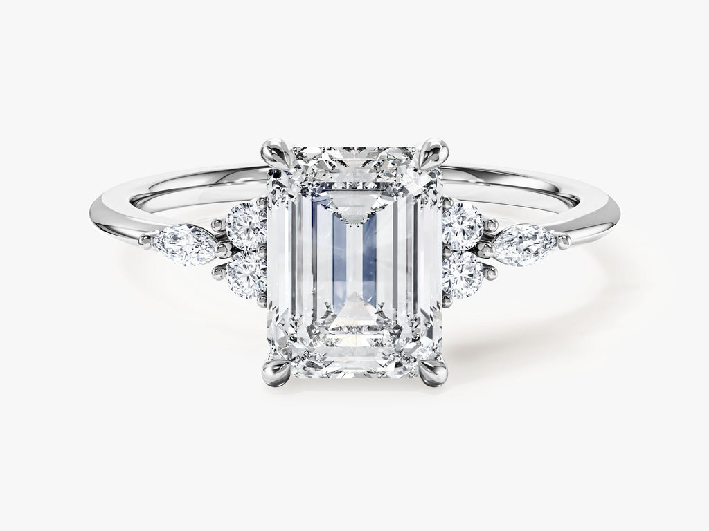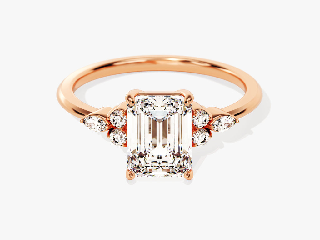 The Round and Marquise Cluster Emerald Moissanite Engagement Ring is a mesmerizing piece that combines classic charm with a contemporary flair. At its focal point, a brilliant emerald-cut moissanite takes center stage, radiating with an enduring brilliance that symbolizes eternal love.