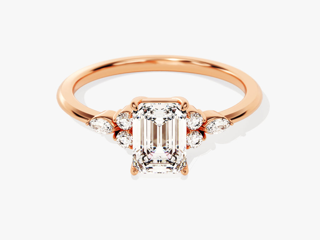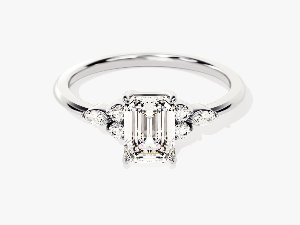 The Round and Marquise Cluster Emerald Diamond Engagement Ring is a distinctive and modern piece that seamlessly combines classic and contemporary design elements. This ring features a cluster arrangement of diamonds, creating a visually stunning and dynamic composition.