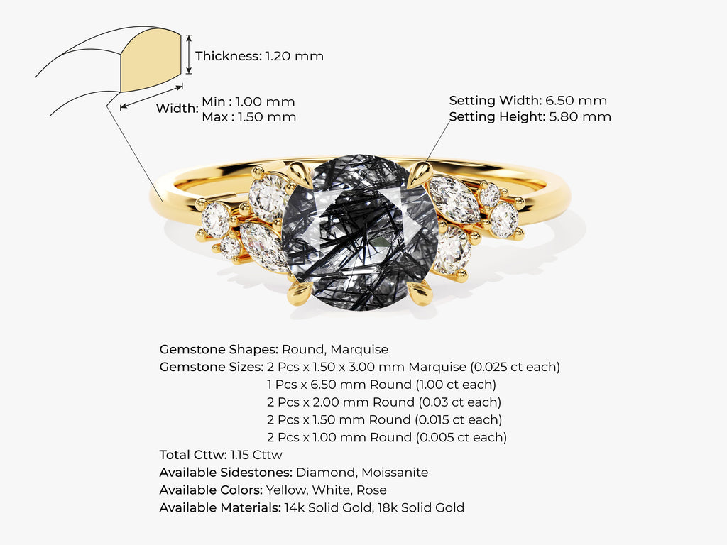 OurRound Black Rutile Engagement Ringis a union of elegance and mystique. The round-cut Black Rutile, rich with dark elegance, beckons you into a world where mystery meets refinement.Surrounding the captivating center stone is a cluster of moissanite gems, sparkling like a constellation against the night sky.