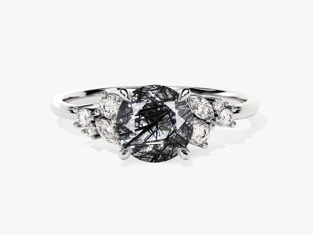 Round Black Rutilated Quartz Engagement Ring with Moissanite Cluster