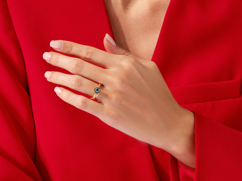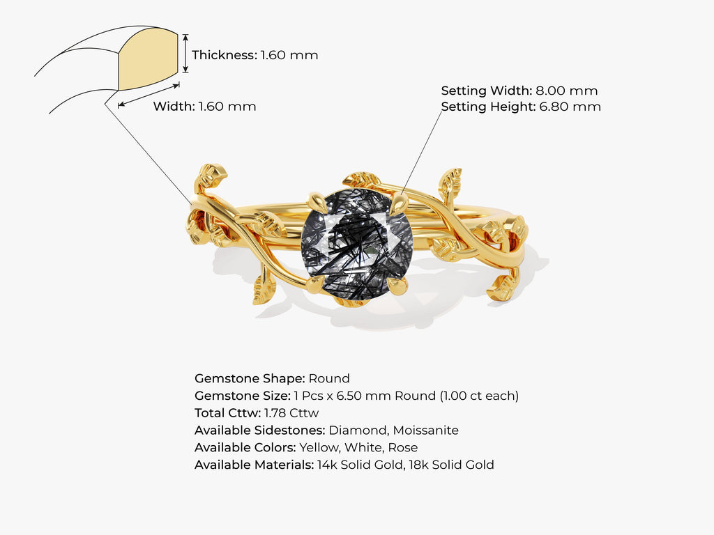 The Round Black Rutile Nature Inspired Engagement Ring is a captivating and distinctive symbol of love, meticulously designed to reflect the beauty of the natural world. At its heart is a round black rutile quartz, a gemstone known for its striking black color and the delicate, needle-like inclusions that resemble the organic patterns found in nature.