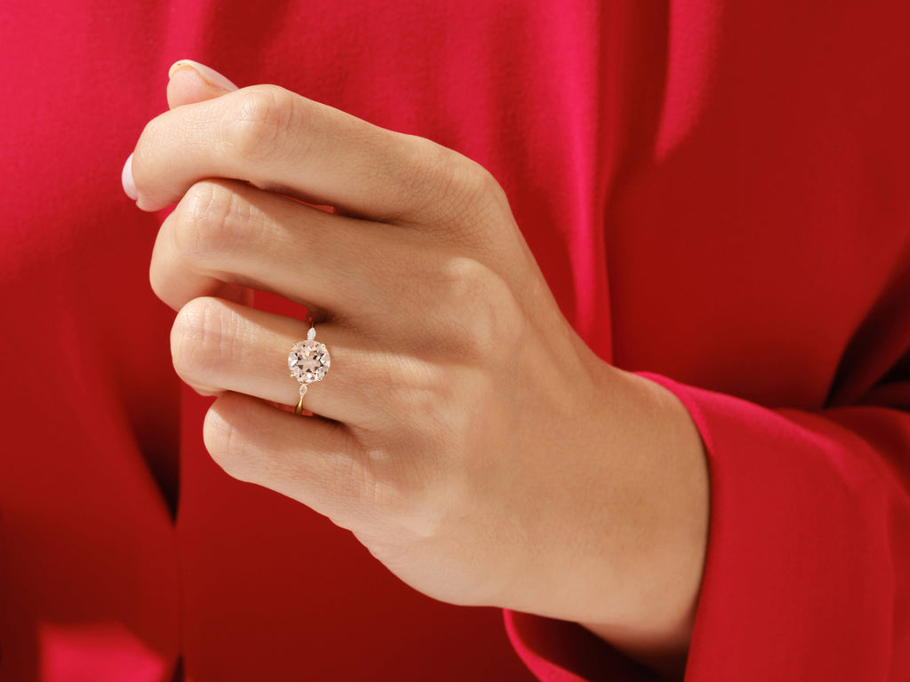 This gorgeous ring has a round-cut peach morganite center stone that radiates a romantic, mellow color that perfectly embodies elegance—flanked by side stones that have marquise and round shapes on either side, giving the design a refined and endearing touch.