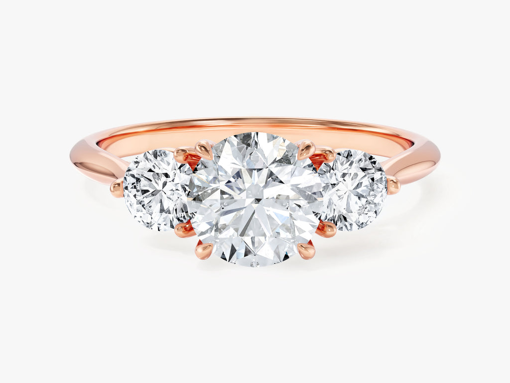 A true classic, this gorgeous round-cut moissanite engagement ring features a center stone that is 1.00 carat and side stones with a total weight of 0.50 carat, beautifully set in solid gold. With a simple but elegant moissanite design, our Trio Round Cut Moissanite Engagement Ring brings together both quality and style in one perfect piece.