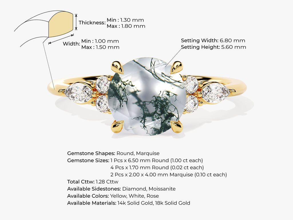 Our Round Moss Agate Engagement Ringis a verdant masterpiece that echoes the tranquility of a hidden forest glade. The centerpiece, a round moss agate, unveils a mesmerizing landscape of lush greenery, capturing the essence of an untouched wilderness.