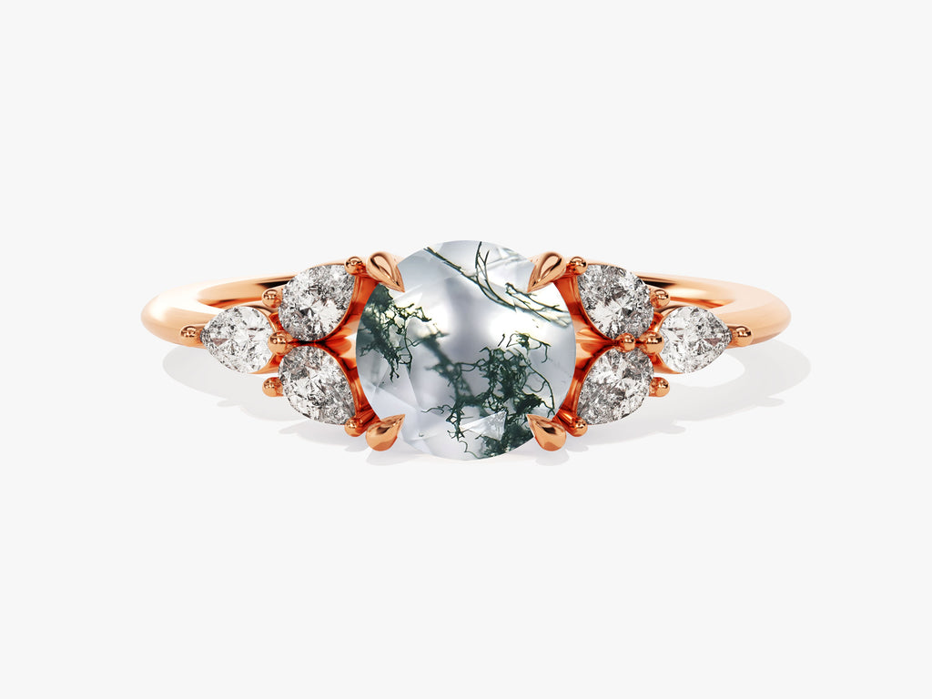 The Round Moss Agate Engagement Ring with Pear Moissanite Sidestones is a distinctive and nature-inspired symbol of love, carefully crafted to showcase the captivating beauty of moss agate alongside the brilliance of pear-shaped moissanite stones.