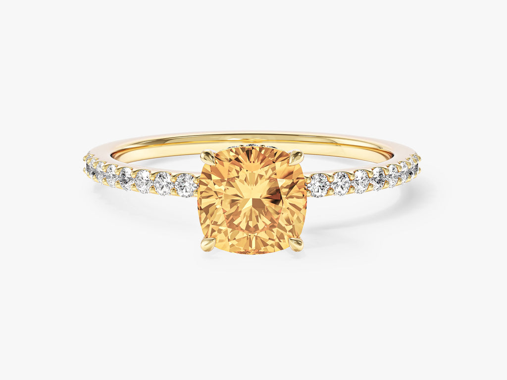 Exquisite and graceful, this moissanite engagement ring in 14k gold features brilliant side stones on its band to complement your cushion-shaped center stone.