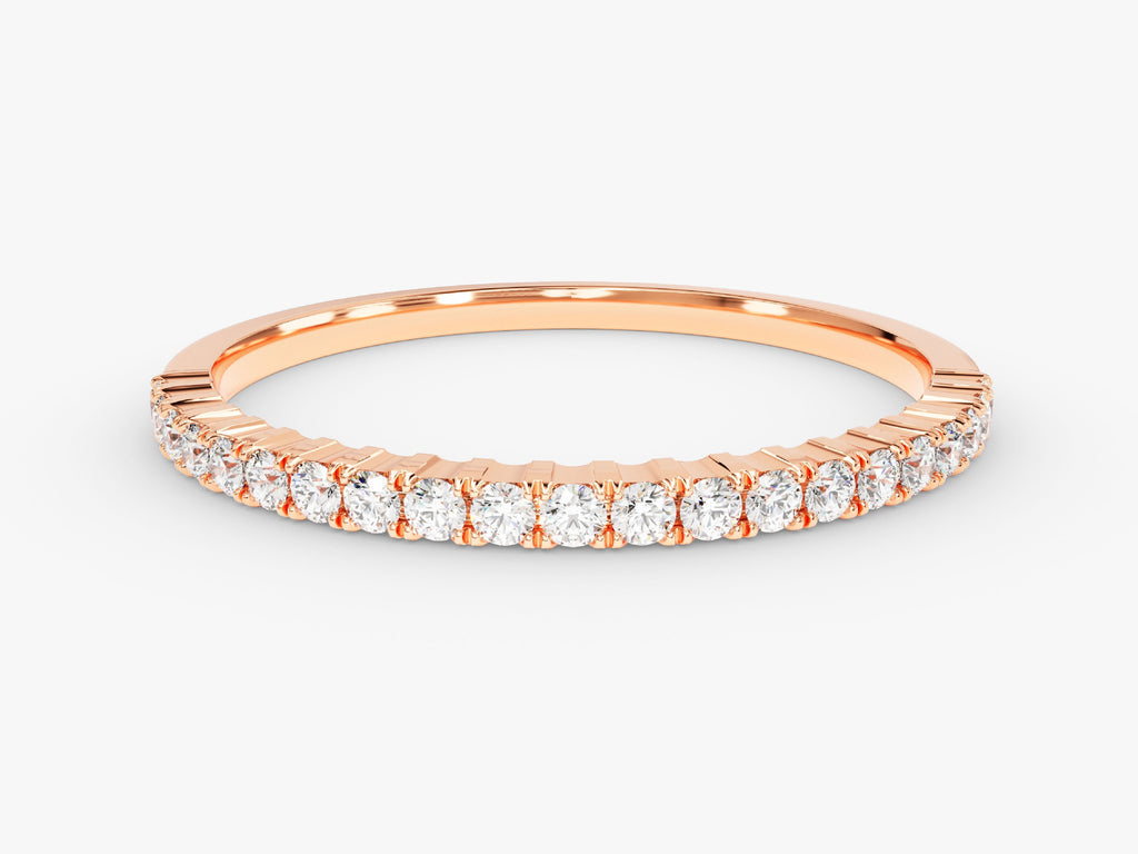 This refined band is a ring that's about to add a whole lot of sparkle to your special day or anniversary celebration! It features a row of shimmering moissanite stones set in a half eternity style. Each stone is carefully placed to catch the light and create an irresistible glow. Plus, with its timeless design, it'll never go out of style.