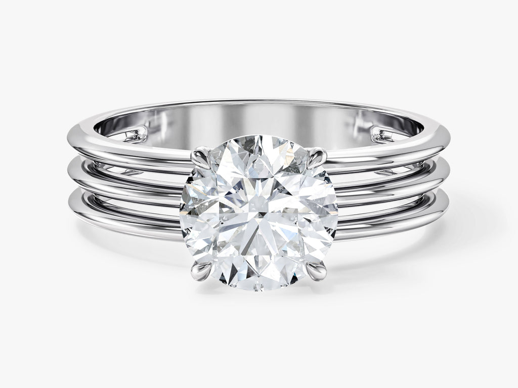 Distinctive and radiant, this design brings a modern twist to timeless brilliance. Three sleek, parallel bands create a bold architectural silhouette, framing the center stone. Crafted for those who embrace contemporary elegance, it’s a statement of individuality and refined style.