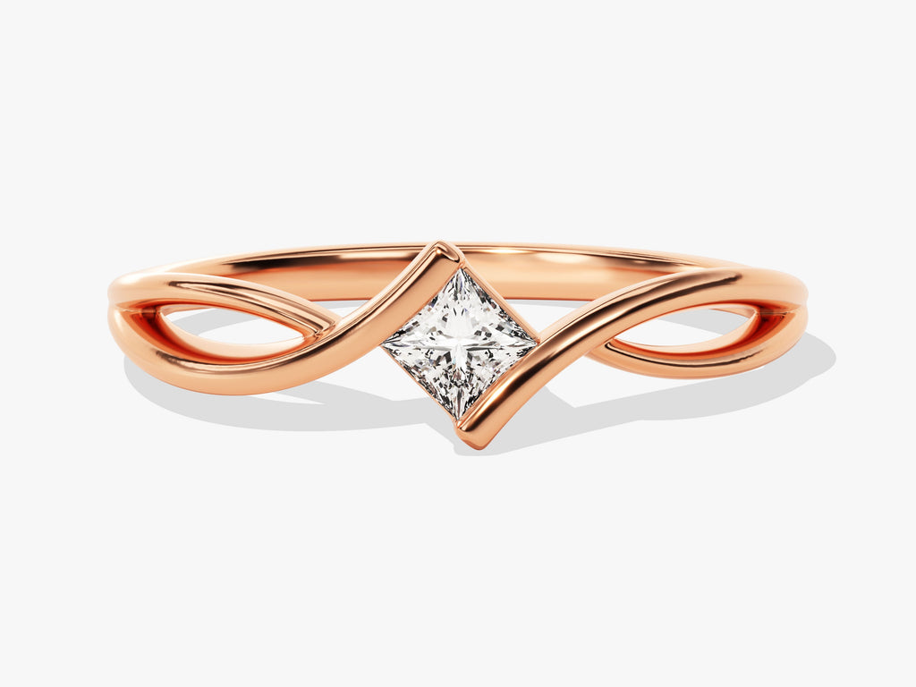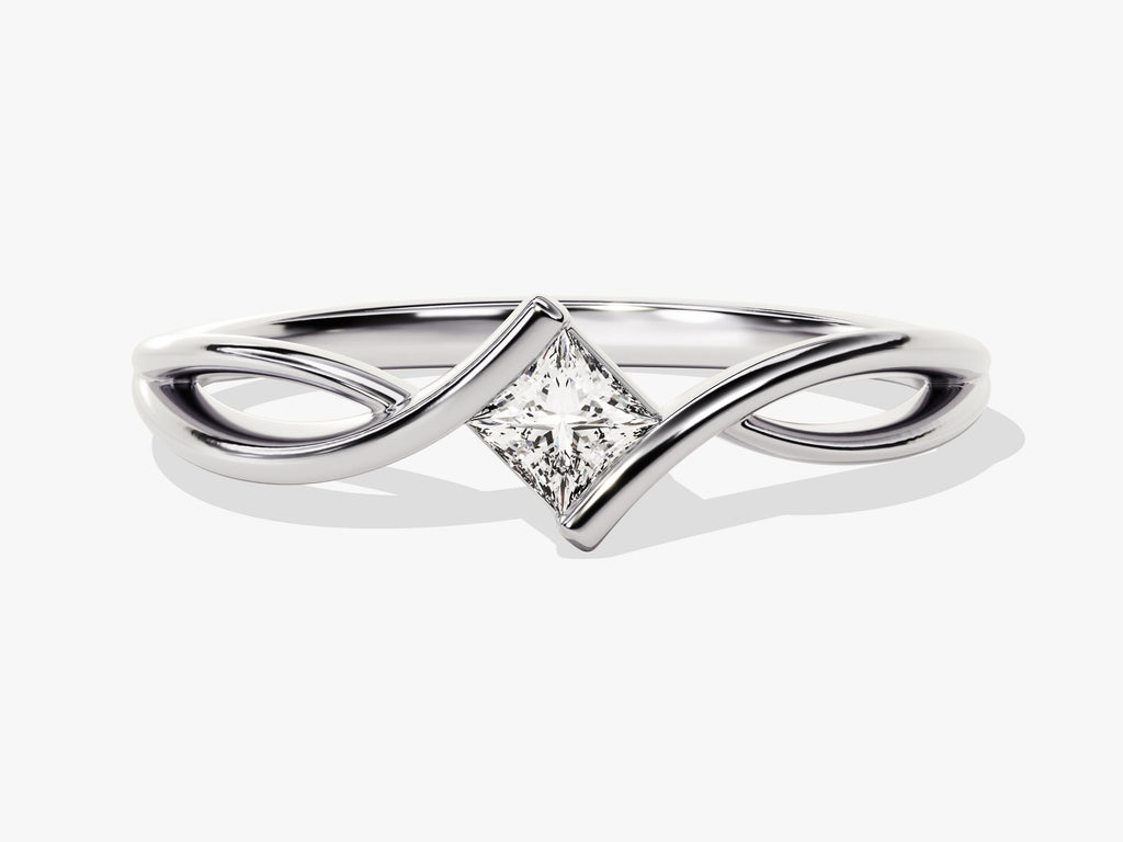 This ring features a striking princess-cut moissanite set in a twisted band design. Combining modern elegance with a unique twist, it is a perfect symbol of your distinctive style and love.