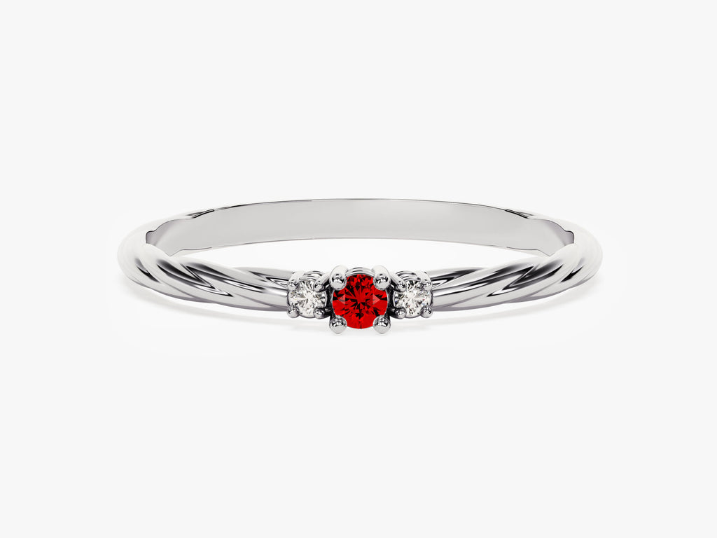 The Twisted Three-Stone Birthstone Ring features a stunning design with three vibrant birthstones set on a twisted band, symbolizing past, present, and future. The elegant twist adds depth and movement to the piece, making it a unique and meaningful accessory. This ring is perfect for celebrating significant milestones or as a thoughtful gift, offering both style and personal significance.