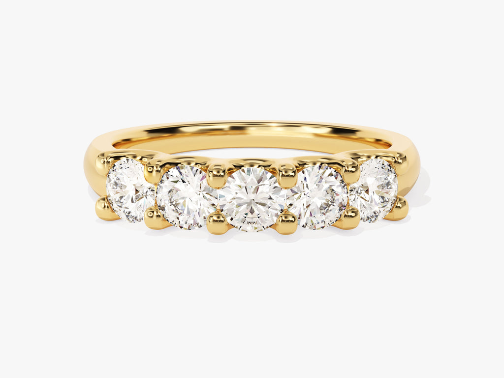 Looking for a band that's both beautiful and meaningful? Look no further than this stunning five stone band. Featuring five sparkling diamonds secured by stylish U-shaped prongs, this band is sure to catch the eye and add a joyful sparkle to any occasion. For your wedding day or an anniversary milestone, it is the perfect way to commemorate your special days and every day in between.