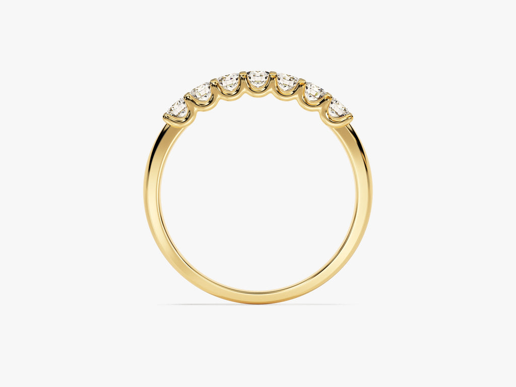 Are you ready to add a little bit of sparkle to your style? This seven stone moissanite band is the perfect way to do so, in all its bright and beautiful glory. Seven moissanite stones are set back to back along the sleek band in U-prong setting. The smooth, polished band feels comfortable to wear every day, so you can show off your love without any worries.
