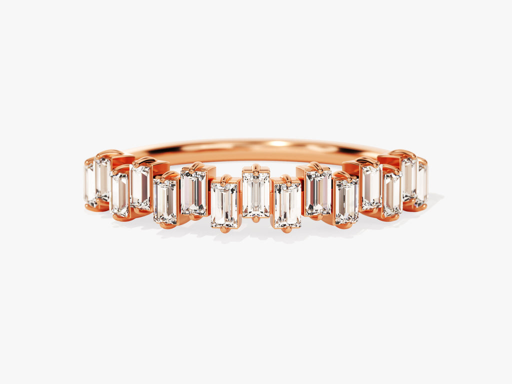 This modern wedding band is like a breath of fresh air in a world of traditional bands. It features delicate baguettes set vertically down your finger, which creates a modern and sophisticated look. This unique design will surely be a reminder that your love story is anything but ordinary.