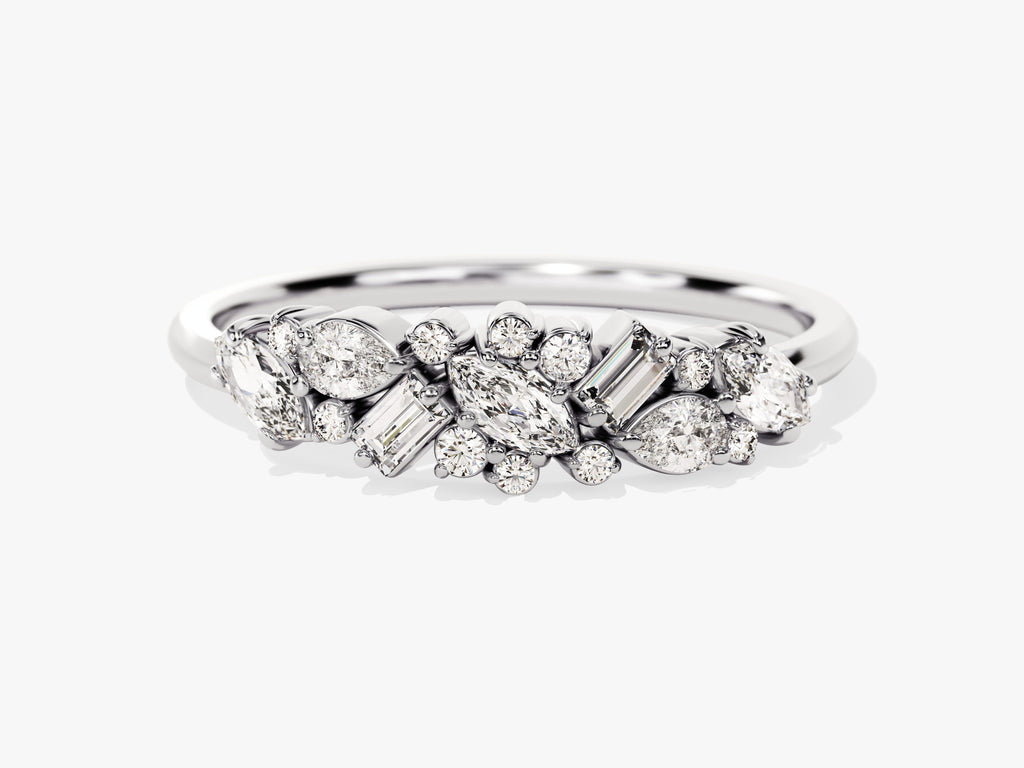 This delicate and sleek band features a dazzling cluster of diamonds set in a vintage-inspired design. Its bold yet timeless design makes it a versatile choice that will stand the test of time, just like your relationship. Whether you're looking for a unique wedding band or an eye-catching anniversary gift, this sleek band is sure to make a lasting impression.