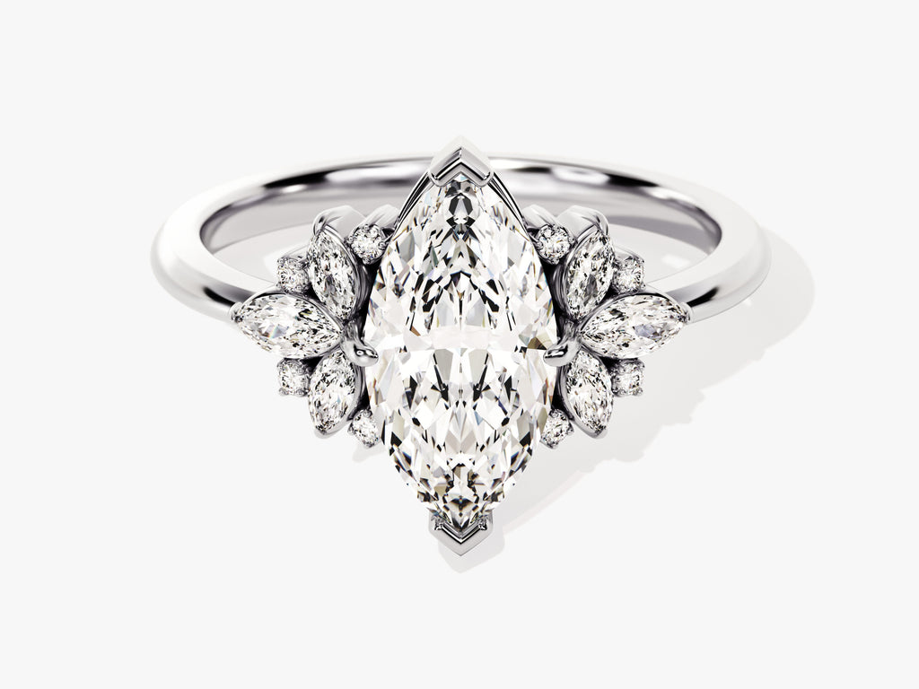 The Vintage Cluster Marquise Cut Moissanite Engagement Ring showcases a dazzling 1.50-carat marquise cut Moissanite as its focal point. Surrounding the center stone are smaller moissanite gems arranged in a cluster formation, evoking a vintage aesthetic.