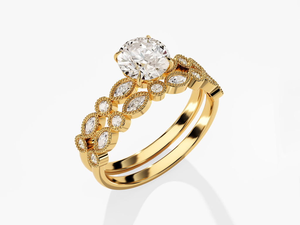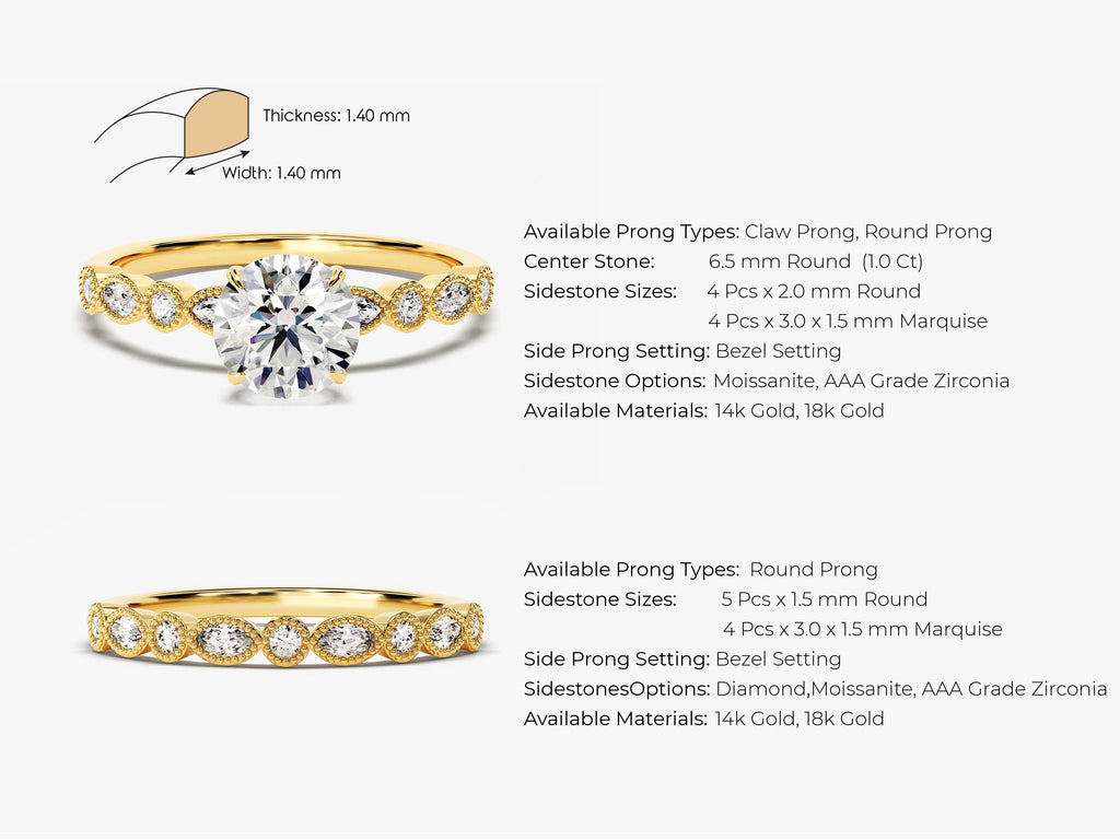 Half Eternity Band blends dashing and elegance together with its alternating marquise and round stones that are gently tapered with milgrain accents. It matches perfectly with the fascinating moissanite engagement ring that features 4 round and 4 marquise-shaped sparkling side stones that complements its round center stone.This set is perfect for brides who want to make a long-living statement with high quality. They come in 14k, and 18k solid gold with the options of yellow, white, and rose colors. Made of 100% solid gold, this set is perfect for those who are after a vintage look.