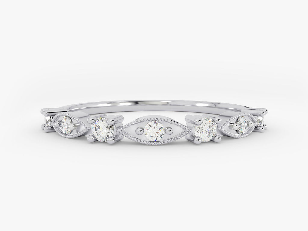 What sets this band apart is its vintage-inspired design that features intricate milgrain detailing that adds an extra layer of texture and allure. It is perfect for stacking with other rings or wearing on its own as a stunning statement piece. After all, when it comes to your special day, only the most exquisite details will do.