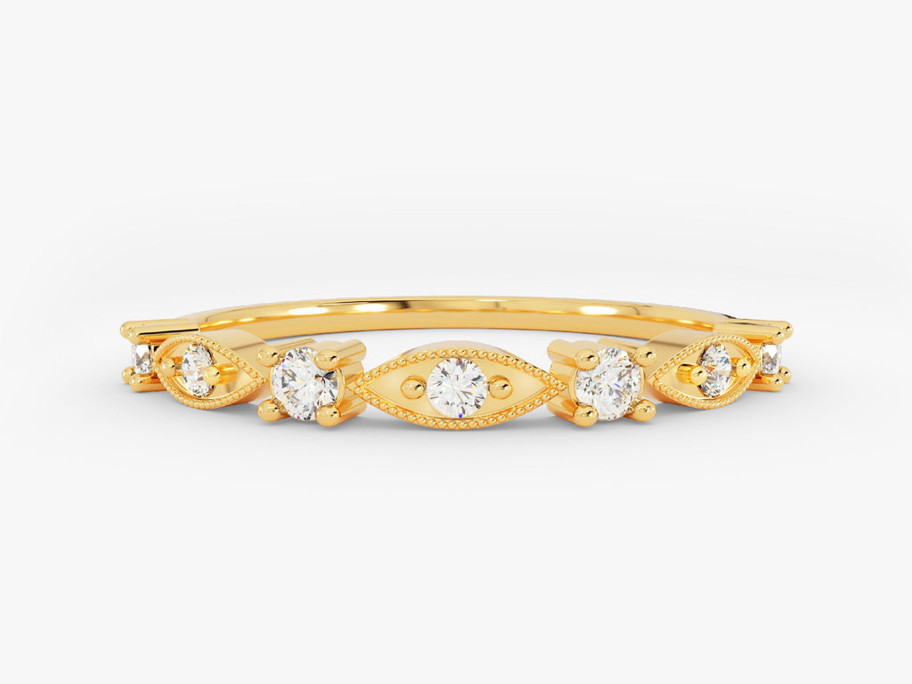 This exquisite band boasts delicate milgrain detailing and seven captivating moissanite stones arranged in a graceful stack. Its intricate craftsmanship and classic design evoke a sense of nostalgia, perfect for vintage lovers and those who are looking for something different.