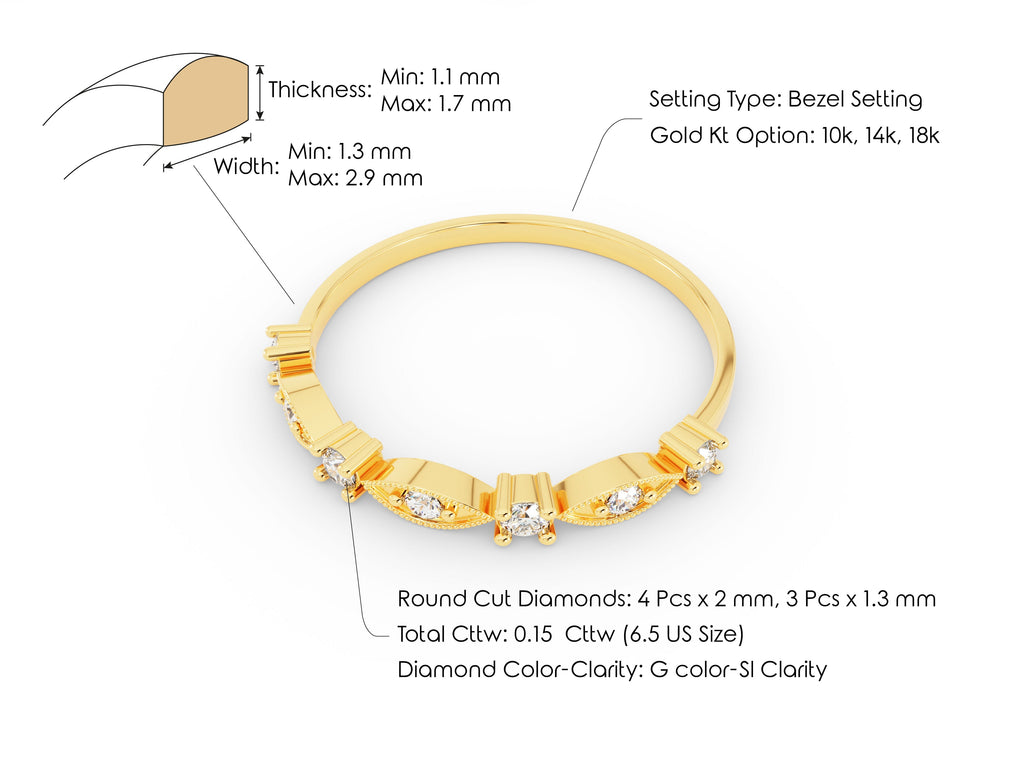 What sets this band apart is its vintage-inspired design that features intricate milgrain detailing that adds an extra layer of texture and allure. It is perfect for stacking with other rings or wearing on its own as a stunning statement piece. After all, when it comes to your special day, only the most exquisite details will do.