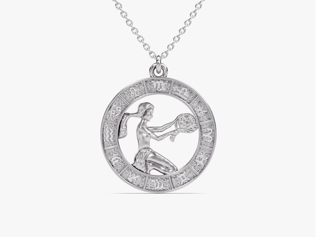 This necklace's heart is a beautifully detailed virgo charm, expertly fashioned from radiant solid gold, gold vermeil or sterling silver. The charm prominently features the symbol associated with virgo – the Maiden. The design is intricately crafted, capturing the maiden's grace and attention to detail, symbolizing the precision and analytical nature of Virgos.
